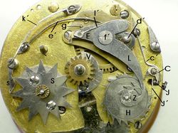 Kommt es nun zur Auslösung der Repetition, dreht sich die Hebescheibe H im Uhrzeigersinn und die Sperrstaffel Z gibt den Hebel L und somit den Einfallhebel E frei. E hat seinen Drehpunkt in d' und wird nun durch die Feder e' mit dem äußeren Ende gegen die Viertelstundenstaffel V geführt und findet dort seine Begrenzung.